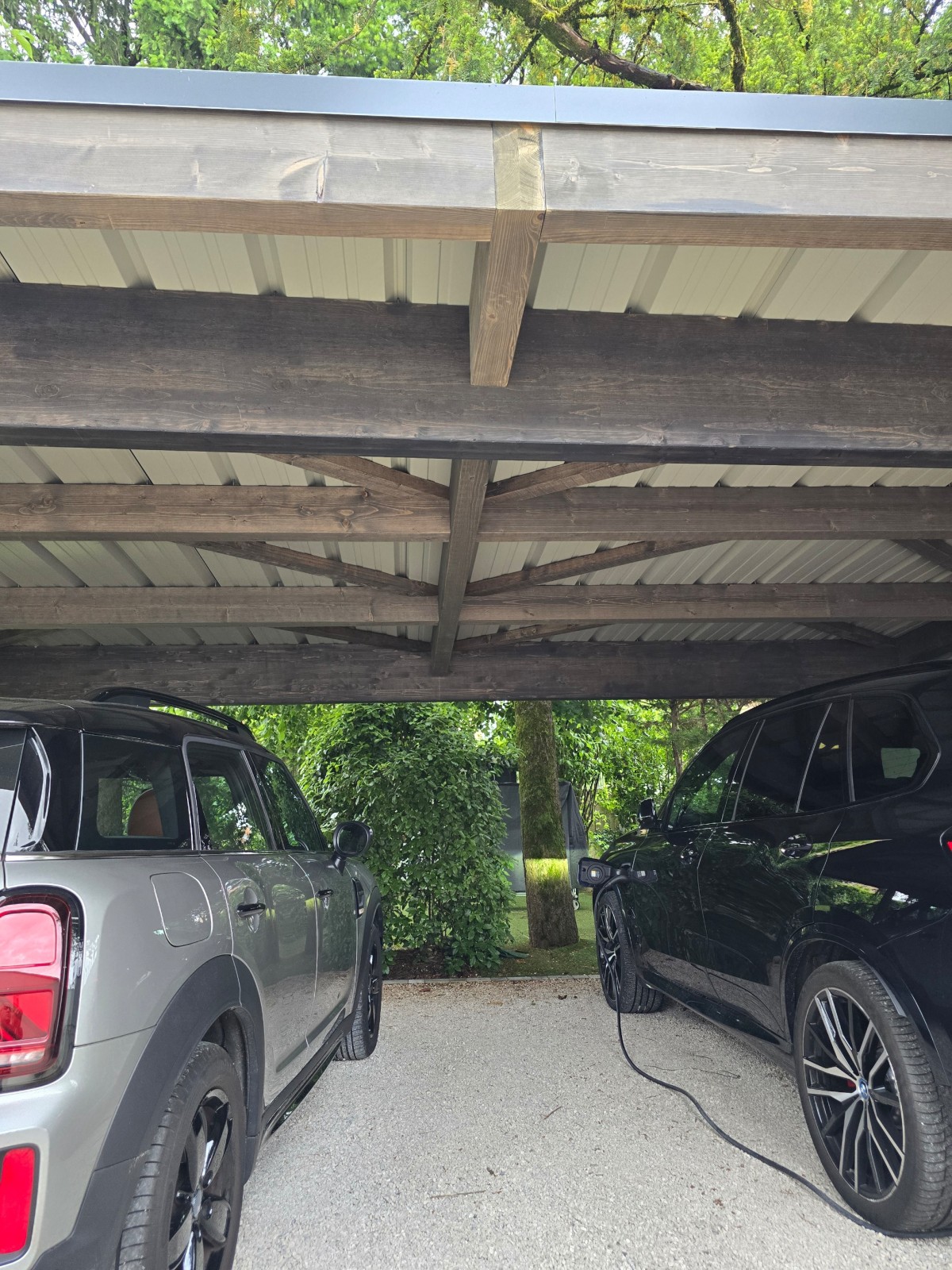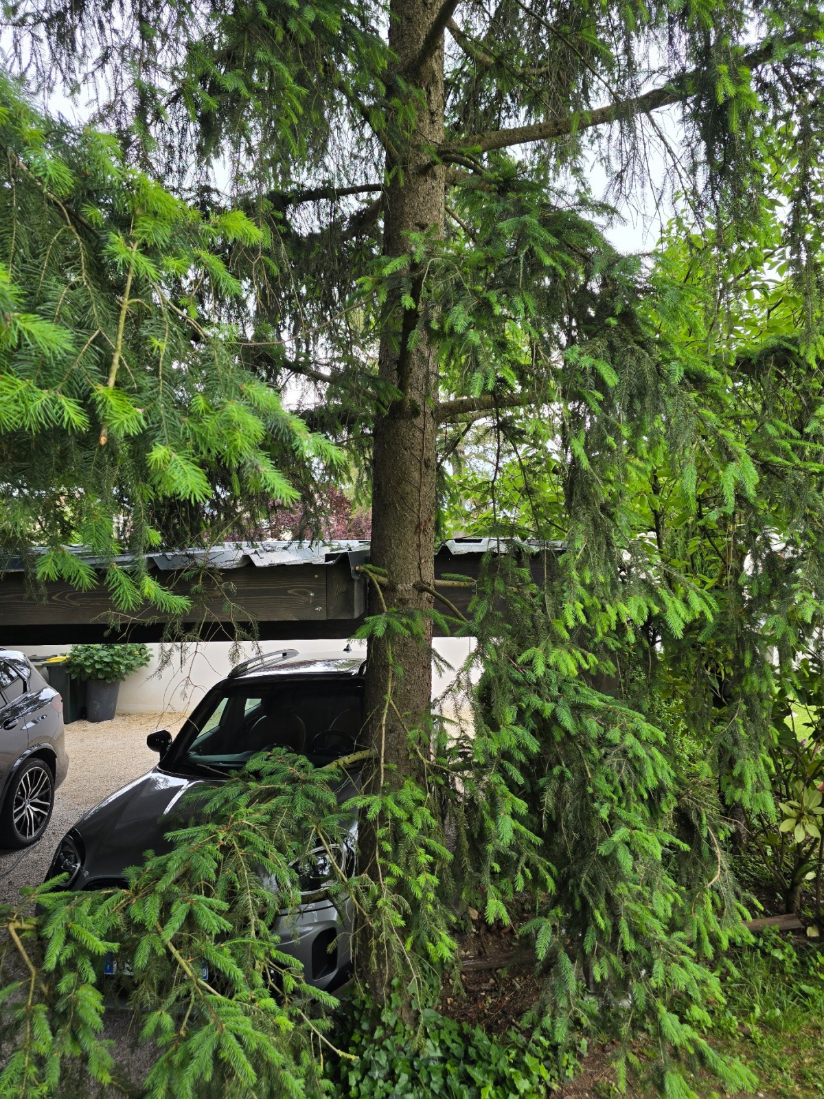 L'emplacement exigu pour stationner les 2 voitures du client, et surtout la présence de 2 arbres qui devaient être conservés ont obligé Rhône Abris à concevoir et poser un carport très spécifique sur mesure.